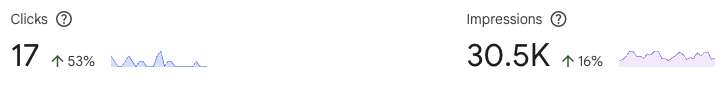 Over the last 28 days, EXOroofing's site got 17 clicks from 30.5K impressions. Clicks are up 53%, and impressions are up 16% compared to the previous period, showing solid momentum. Impressions are climbing steadily, meaning Google is showing your site to more people. The next focus is pushing those rankings higher to get more pages onto page 1 and page 2, where the majority of clicks happen.